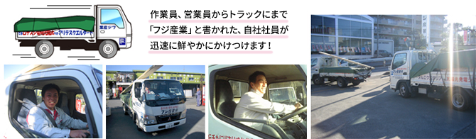 作業員、営業員からトラックにまで「フジ産業」と書かれた、自社社員が迅速に鮮やかにかけつけます!